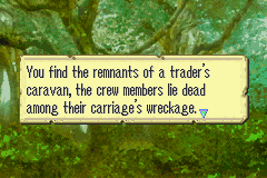 "You find the remnants of a trader's caravan, the crew members lie dead among their carriage's wreckage.