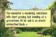 "You encounter a wandering swordsman with short graying hair kneeling at a gravestone.