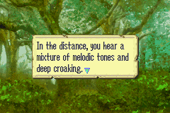 "In the distance, you hear a mixture of melodic tones and deep croaking.